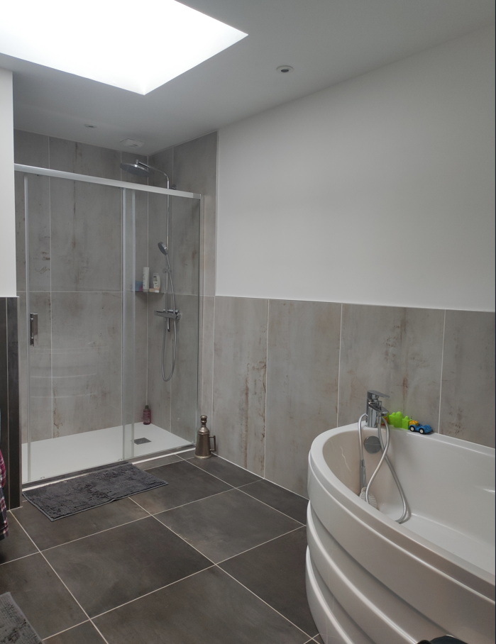 La vaste salle de bain, épurée, au goût du client a été parachevée par nos carreleurs avec en particulier la pose de carrelage grand format et de faïence aux couleurs intemporelles